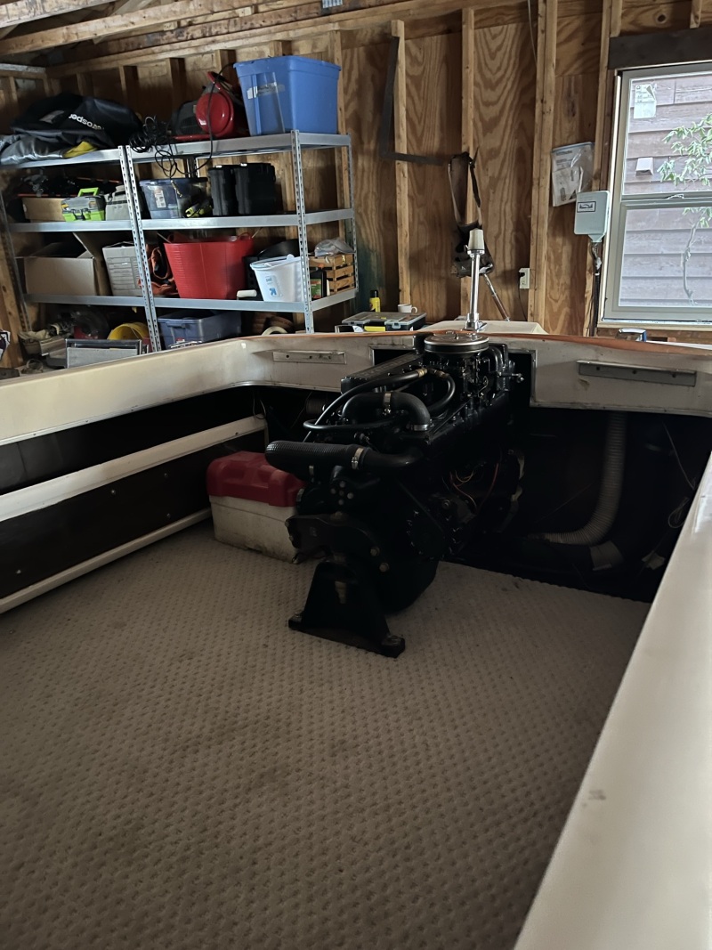 Completely restored this winter, engine professionally repaired at a marina, new coupler, new hydraulic hoses, new floor, carpet, seats, vinyl, etc. 120 HP Mercruiser I/O have receipts of the work done on it. Recently buffed and polished. Amazing condition for its age. Stringers and floor will last the rest of its lifetime.