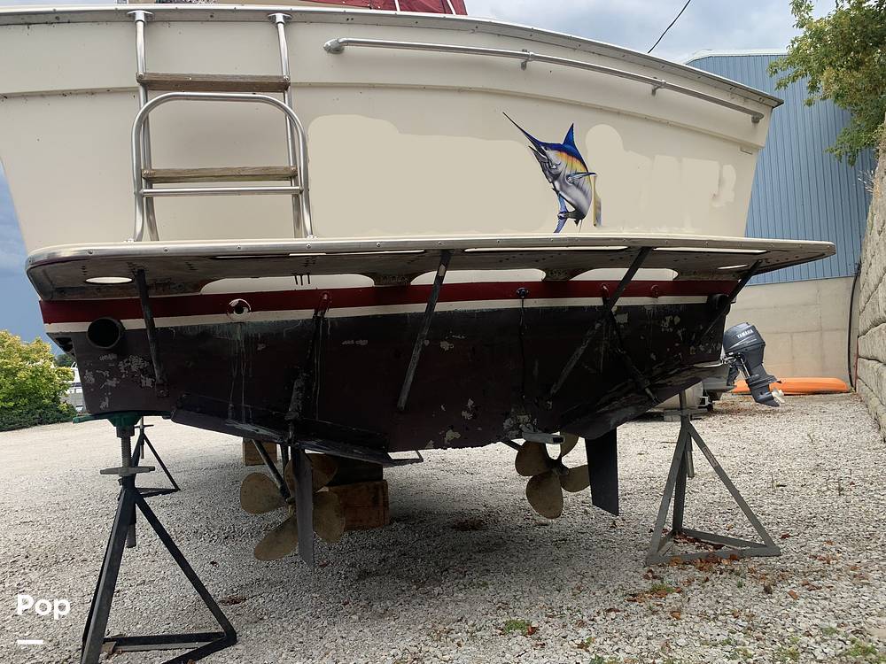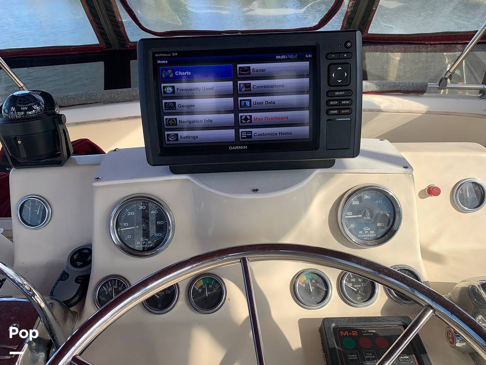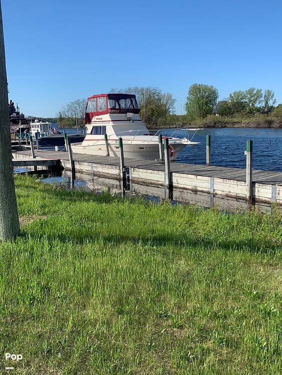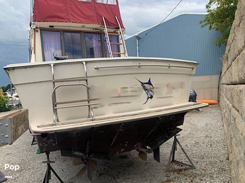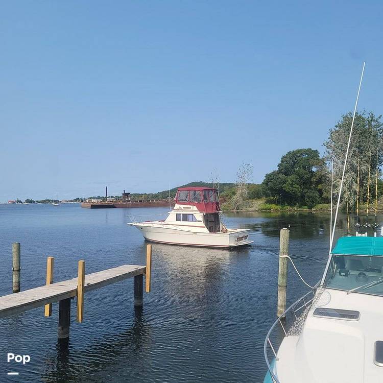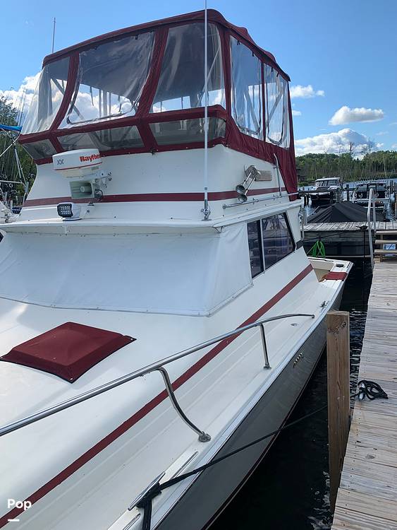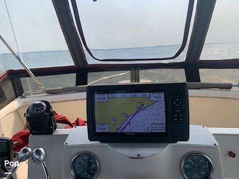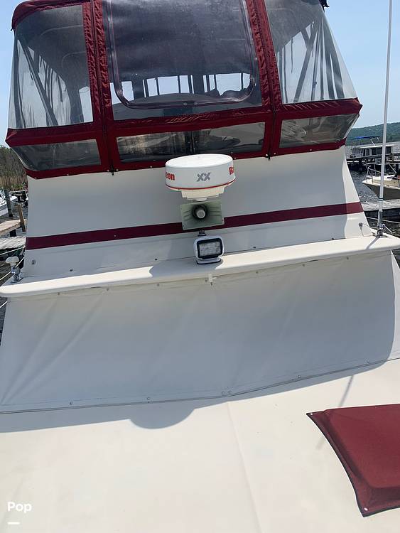 The flybridge offers control of the 2 -CH350 gasoline engines. Electronics include Garmin GPS, Newer VHF Radio and Raytheon Radar (needs repair).