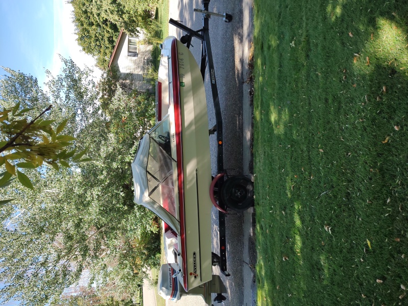 The outboard motor is a 1977 Evinrude 85 hp, with a Shoreline Model 16 boat trailer. There is a boat cover as well.