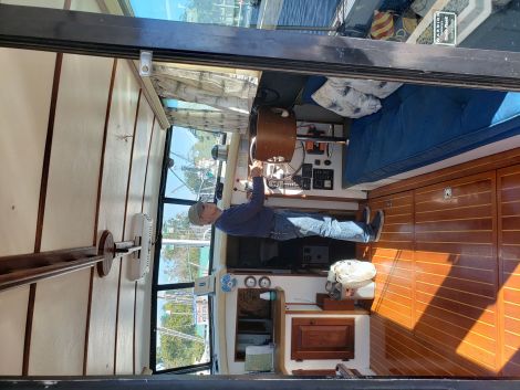 Roomy main salon with table, chairs, and sofa that can fold out for an extra bunk. There is storage in the table, under the sofa, and in the cabinets. The lower helm station in main salon.