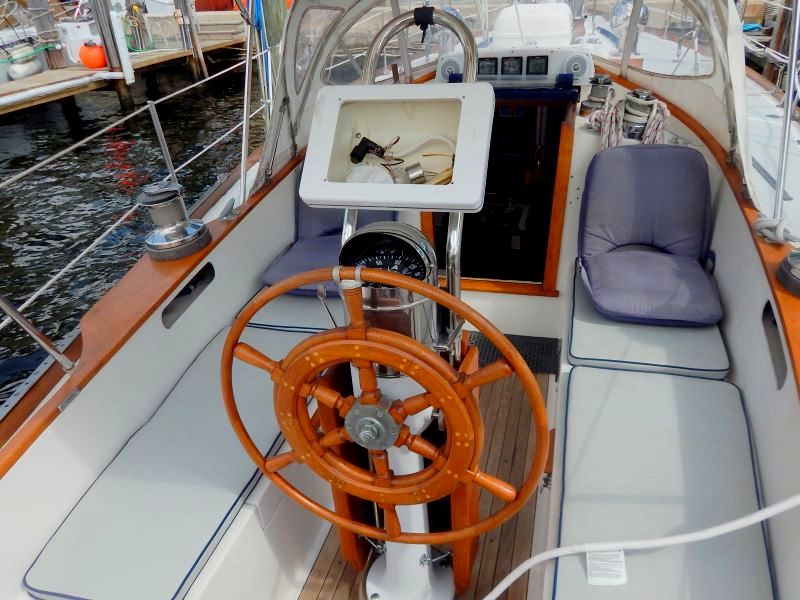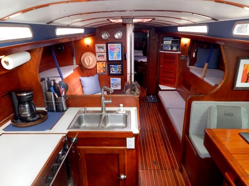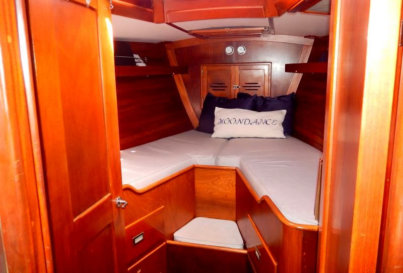 Enter the vessel from the centerline companionway and down 4 steps (some opening) to see the galley to port with huge stove top and oven, sinks, top loading fridge/freezer and abundant counter tops. Aft find the custom dish rack, storage drawers, cubbies and forward the storage cabinets and under sink storage. Moving forward find the port settee 6'8” in length with cubbies and cabinet storage behind with a pilot berth above 6'8” in length. Teak hand rails run above the berths and below the windows for the full length of the salon for safety. There is a drop leaf dinette table centerline with access to the centerboard trunk underneath followed forward by the roomy double door head with new composting C-Head toilet (holding tank and standard toilet plumbing still there), counter and sink, mirrored cabinet, other cabinets and lockers, hot and cold custom faucet, soap dish, shower curtain with track and hand held and wall mounted shower head. Moving forward is the beamy V berth stateroom with multiple draws and storage lockers, access to an amazingly huge anchor locker with P and S shelves, storage area and access to the windlass motor and chain locker. The forward stateroom has shelves, opening hatch with stow away screen, multiple cubbies and book holders as well as a clock and Barometer and huge hanging locker to starboard. Under berth storage drawers and cubbies as well. Leaving the stateroom aft to starboard find another hanging locker and custom built cabinet for the air conditioner with marble shelves and more storage followed by the starboard settee and pilot berth with storage behind identical to the port side settee with book shelves above. Moving aft find the aft facing navigation desk with opening lid, battery monitors, VHF radio, electrical panels and storage under desk and seat. Aft is the companionway hanging locker and 3 drawers . The entire vessel has a white solid headliner with teak trim strips making the interior bright and airy. Moondance sleeps 6 owners and guests in 1 stateroom and 4 salon berths and has one head with shower.