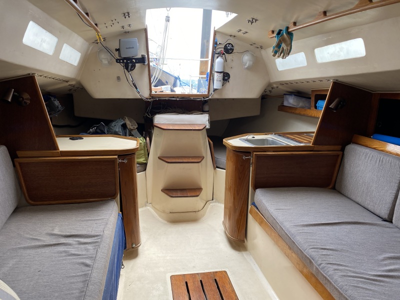 VHF radio, GPS, radar, usual windspeed, depth, speed, etc… Nexus/Sailcomp instruments available for upgrades, but not installed. Stereo with speakers in cockpit and cabin; galley with sink and stove (alcohol)