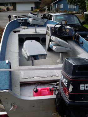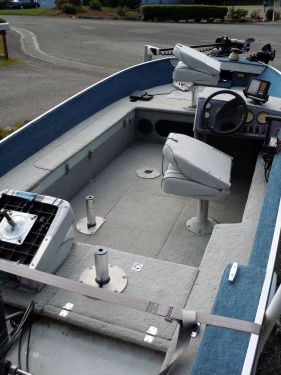 fully carpeted, steering column, 4 open locations of swivel seats (2 included with 3 posts), stationary swivel captains chair, rod cabinet, gear and tackle storage