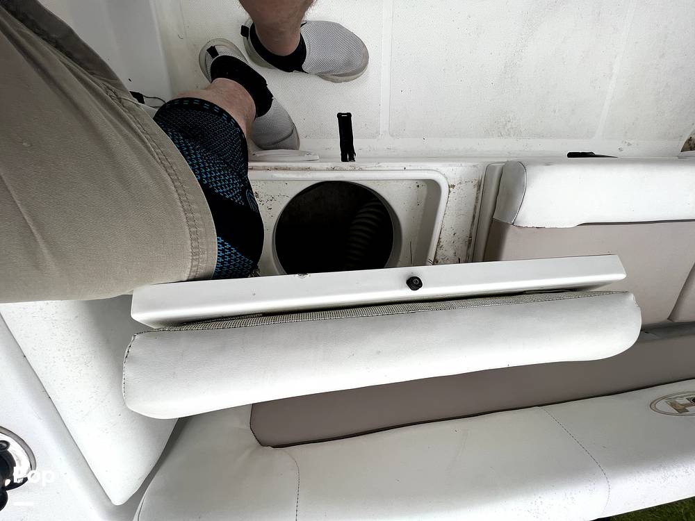 The cockpit area is roomy and the bench forward seats three on either side. No rips or tears in the vinyl. It does show some age but still looks pretty good. Lots of room to fish or hang out in the aft area with the fold-down seat folded up. Engine area access is great!
