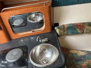 Down below is a head, well-equipped galley area with a stove, sink, and mini fridge