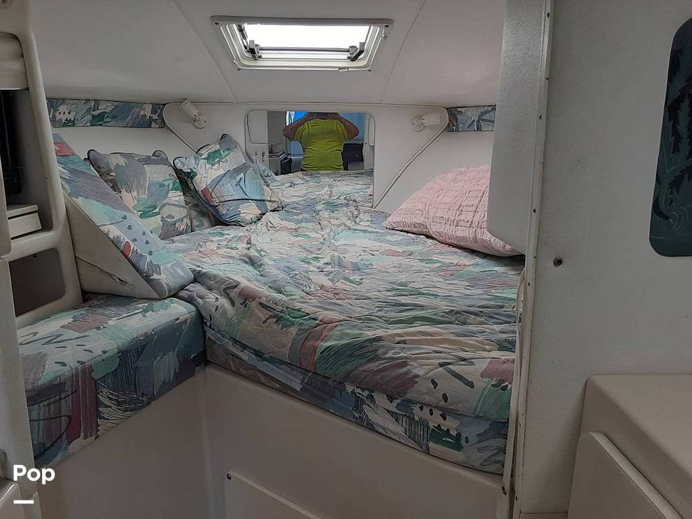 What really makes this boat nice is the mid-cabin layout that sleeps six! It has a convertible U-shaped dinette to starboard a Double V-berth forward and double berth aft. The V-berth has a residential custom mattress.