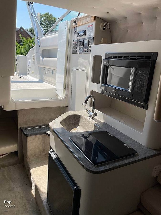 The salon is well-appointed and accommodating. The galley is equipped with a ceramic cooktop, microwave and refrigerator. The galley sink has pressurized hot and cold freshwater.