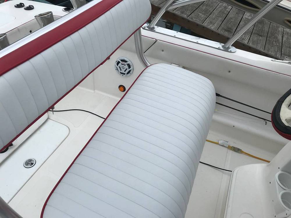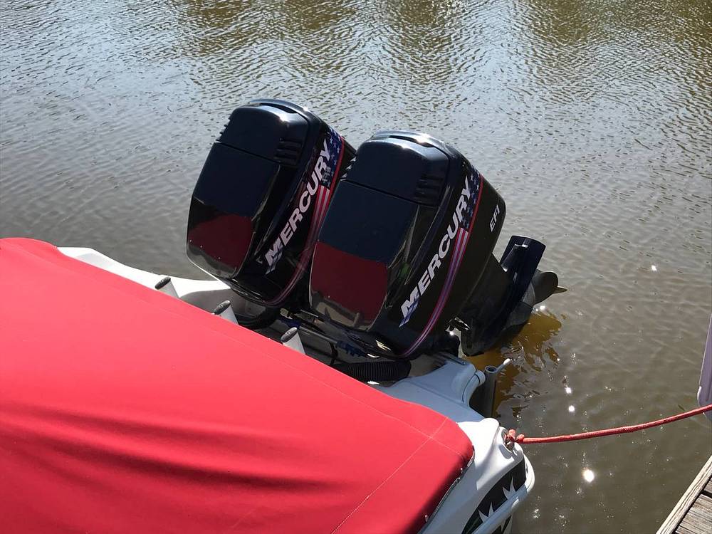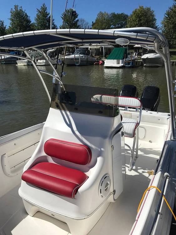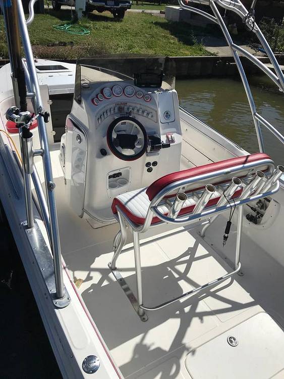 Some of the other features include an electric bilge pump, navigation lights, anchor locker, cabin hatch, Bimini top, four updated batteries, multiple drink holders and rod holders, lockable glove box and cabin door, pull-up stainless steal cleats, plumbed live well, cabin and cockpit lights, 12v power outlets, and analog engine gauges.