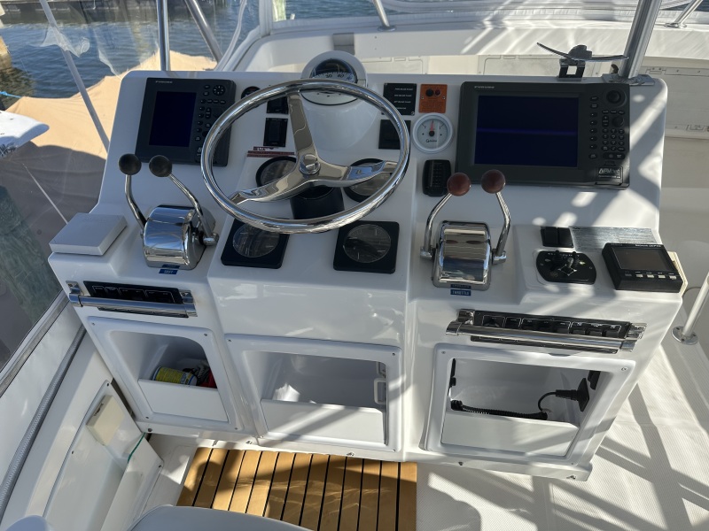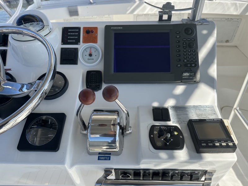 Furuno chart plotter with radar, fish finder, Yanmar engine multi-gauges, B&G Depth sounder, Ritchie Helm Compass, Fusion BT stereo system with JBL amplifier for Bridge and deck speaker system (separately controllable), cell phone signal enhancer, Wi-Fi signal booster with modem, Sony DVD Player and AM/FM/CD stereo in salon. Standard Horizon Quantum AIS GX6000 25W VHF/FM Marine Transceiver with bridge and salon controls/intercom and Bridge arch speakers for hailing other boats or automatic fog signaling. Bridge Arch mounted remote controlled spotlight.