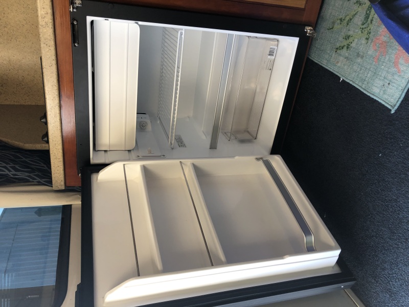 AC/DC Refrigerator with freezer compartment, electric stove, microwave, double sink, coffee maker, dining table.