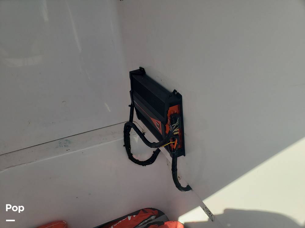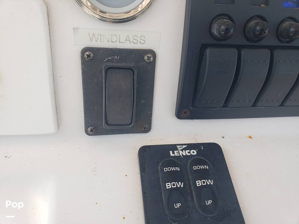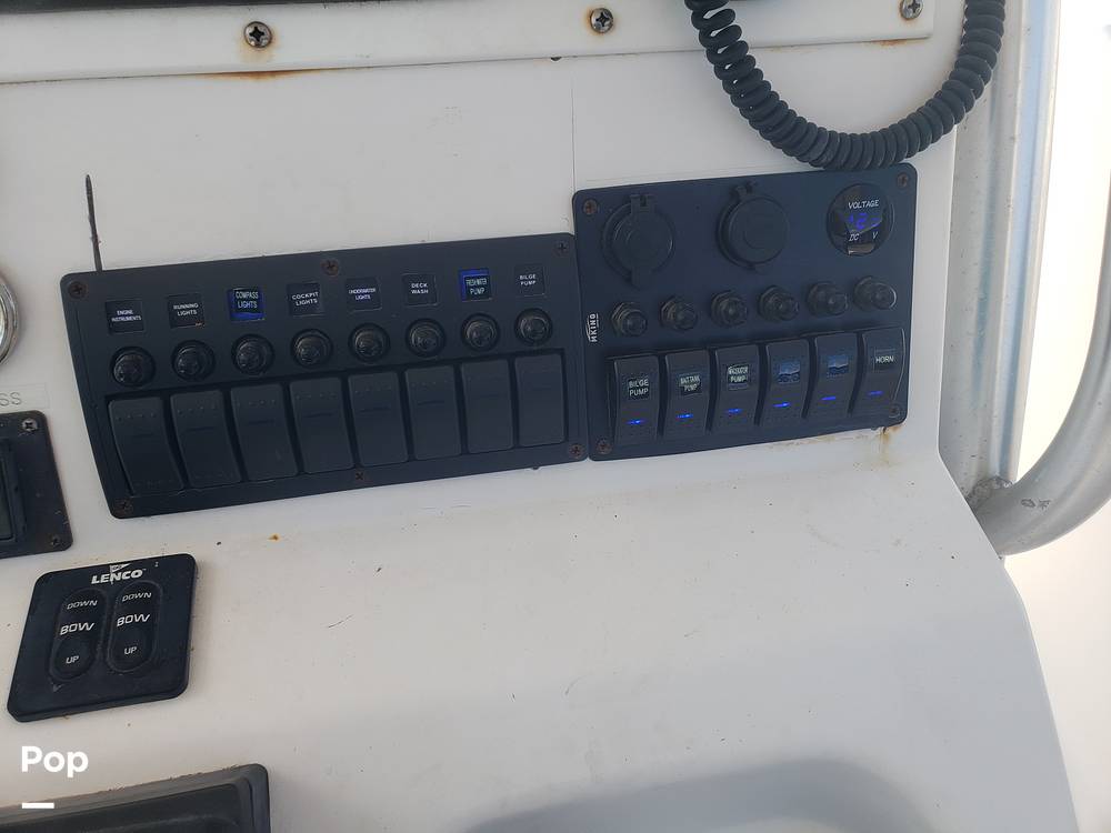At the step-up helm is a new electronics suite. It includes twin touch screen 12 Garmin displays for GPS/FF/Plotter/Radar, a Wet Sounds stereo that has two amps, sub, console and deck speakers with LED lights, twin tower speakers with LED lights, new engines gauges, Sionyx night vision camera, accent lighting, and a Standard VHF. There is Sea Star hydraulic steering, new high-back helm seats with armrests, flip-down bolsters with rear rocket launchers. Lenco trim tabs controls, and beverage holders are nearby.