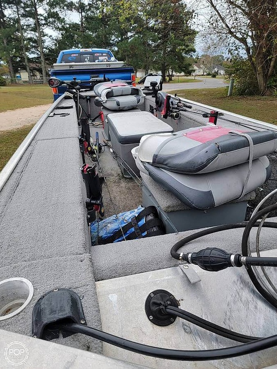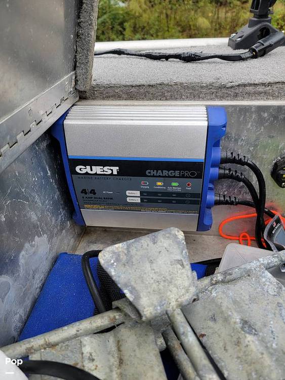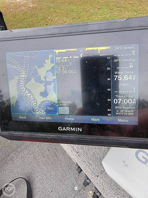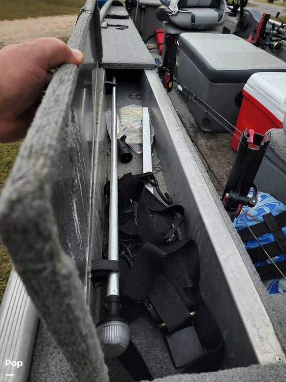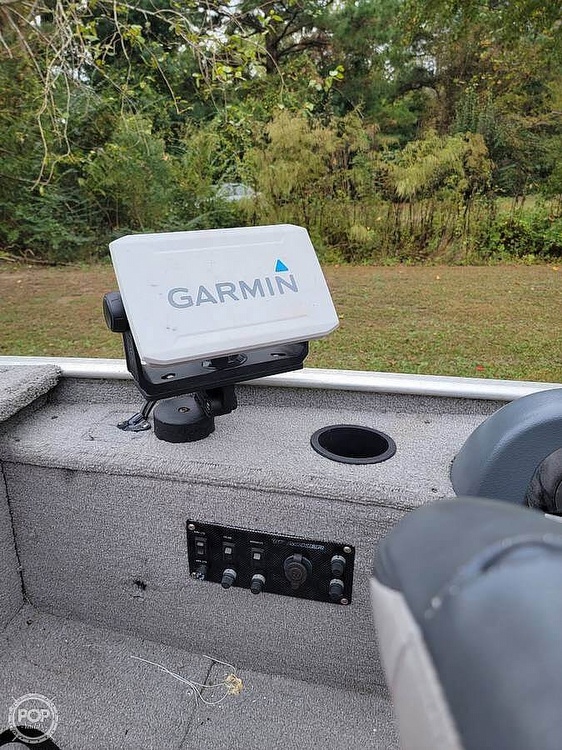 This Panfish is loaded with extras, such as a Garmin depth finder with GPS, Chirp, chart plotter, and fishfinder. It also offers navigation lights, an aerated live well with a seat cushion top and removable baitwell, 8 rod holders, and an onboard dual battery charger.
