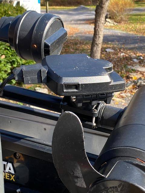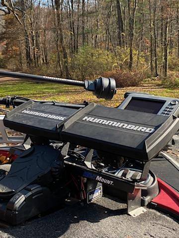 Upfront on the bow there's a Minn Kota Ultrex 112 lb trolling motor with spot lock and remote control accompanied by three screens on the deck: A 12 inch Humminbird Helix with mega-live imaging, a 10 inch Humminbird Helix connected to mega 360 imaging and also an 8 inch Lowrance HDS for sonar and mapping. The seller is including the mapping chips that came with the units, too.