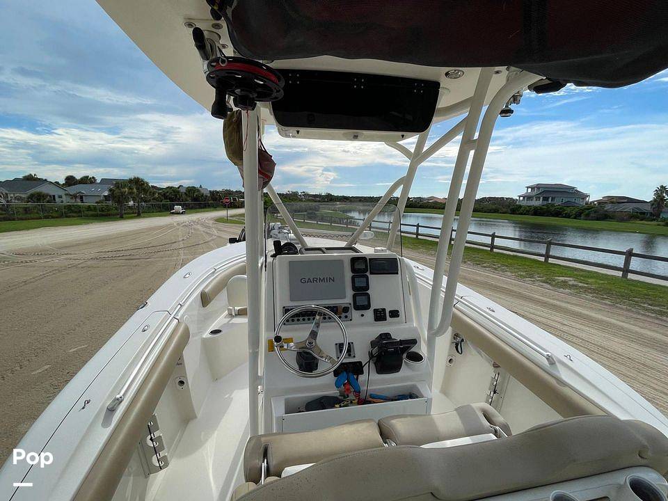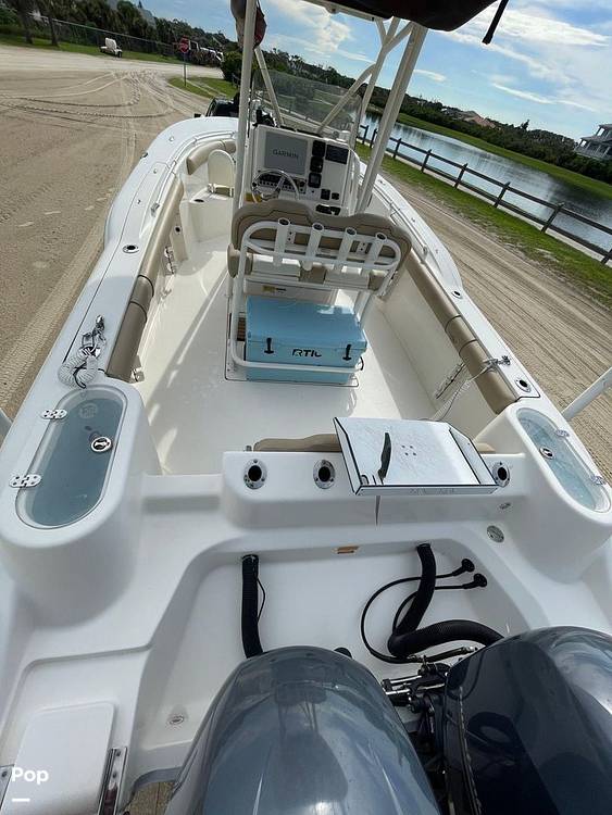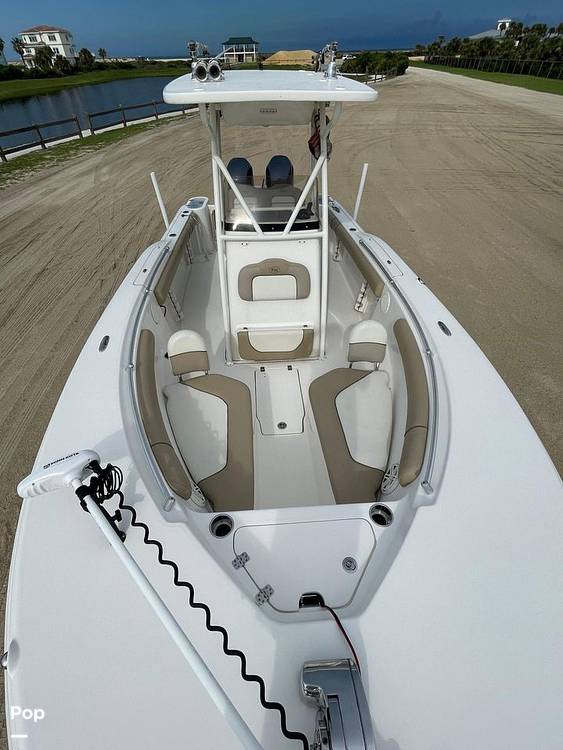 This Key West features a large cockpit, hardtop with rocket launchers, leaning post with dual bolsters, bow seating area with cushions and storage, Minn Kota i-Pilot trolling motor, windlass, Garmin GPS-fishfinder, Fusion stereo system, VHF radio, Taco outriggers and two livewells.