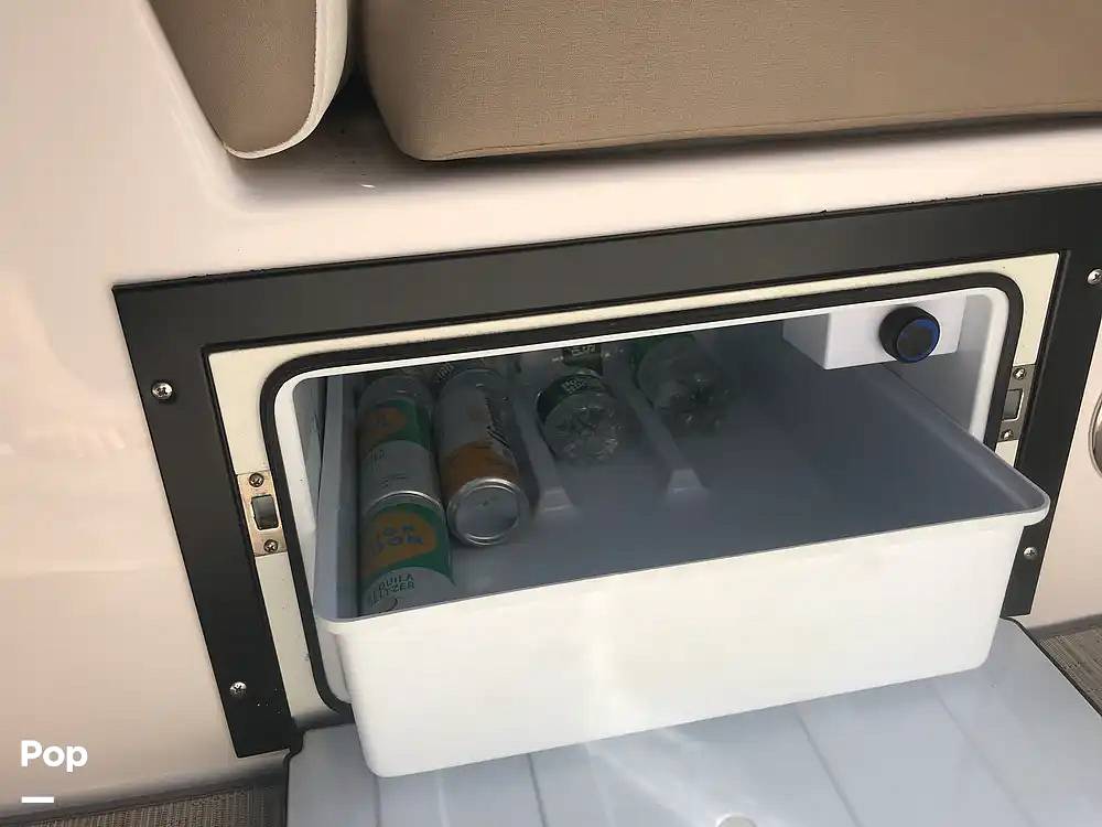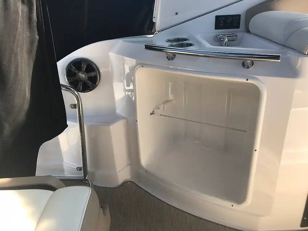 The Captain has a double-bolster seat with a portside full-length adult-size lounge. Tucked under the lounge is a perfectly sized icebox.