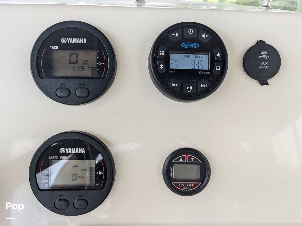 For comfort, the boat includes a cushioned flip-flop cooler seat, a tinted windshield with a grab rail, a 12-volt power outlet, and courtesy lights. The helm is equipped with a stainless steel steering wheel and anti-feedback mechanical steering. With a 40-gallon fuel capacity, it's perfect for extended trips.