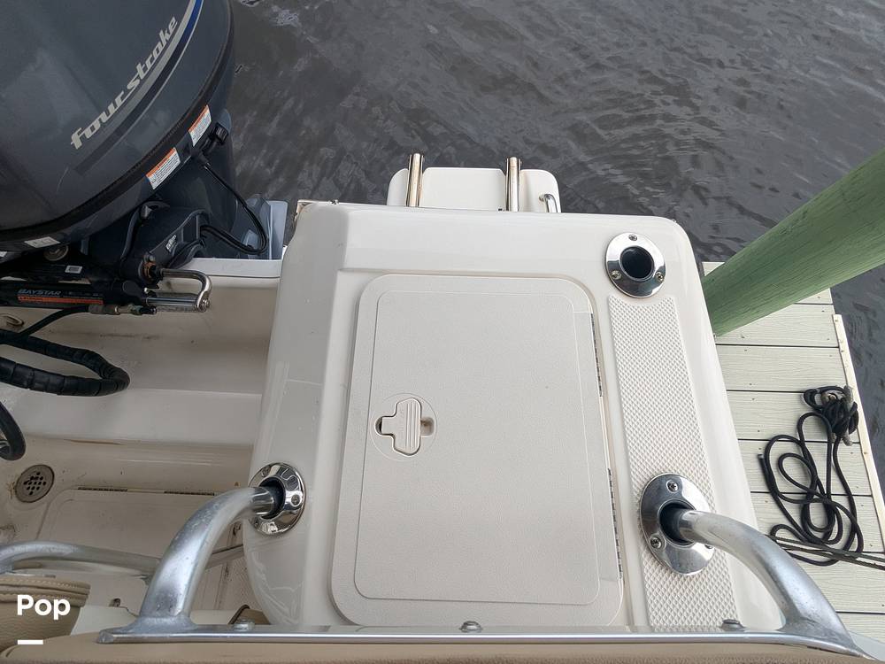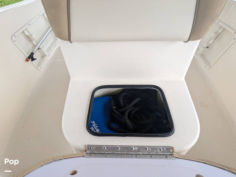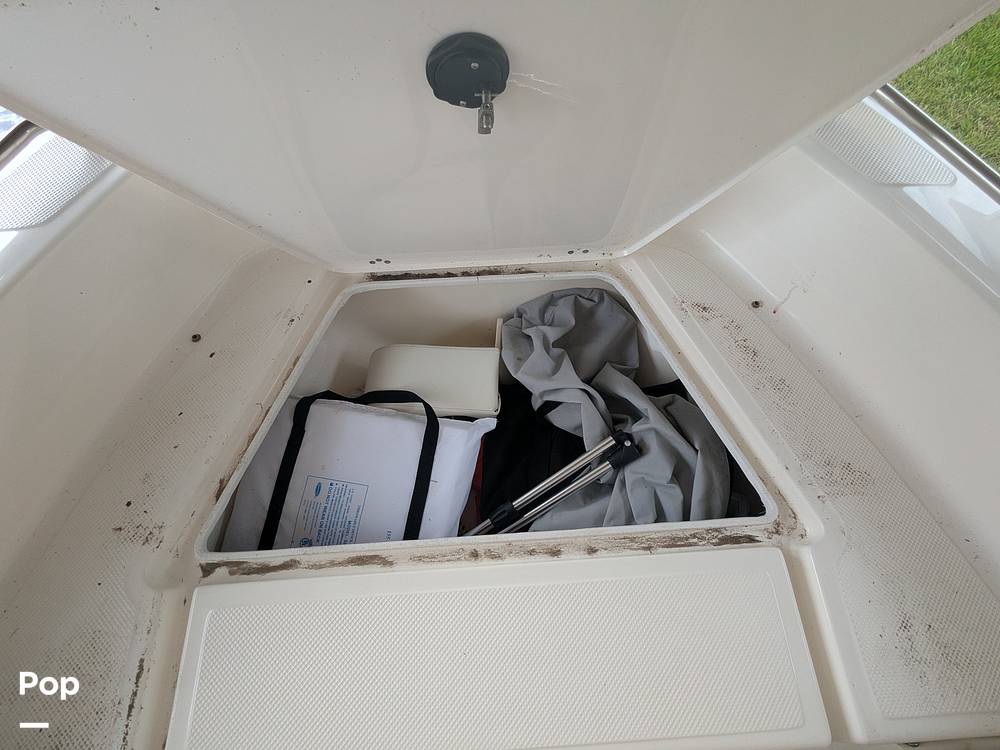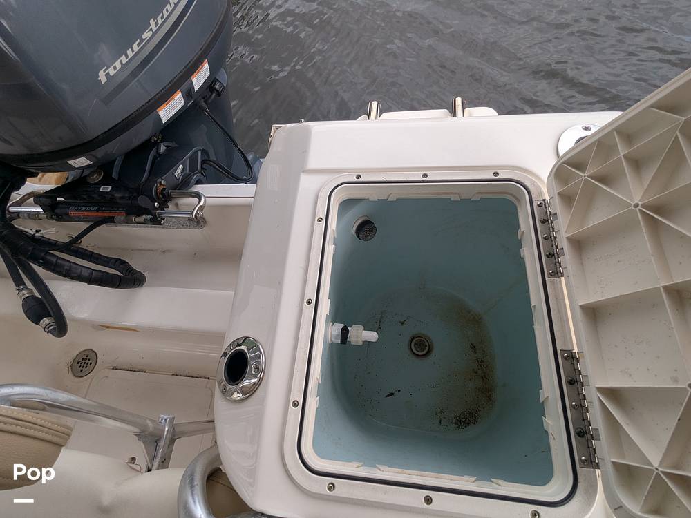 The spacious, self-bailing cockpit features a non-skid liner, stainless steel hardware, and includes a bow rail, pull-up cleats, and four trolling rod holders with drains. Anglers will appreciate the high-speed pickup livewell and horizontal gunwale rod racks, while a large bow storage compartment offers ample gear space.