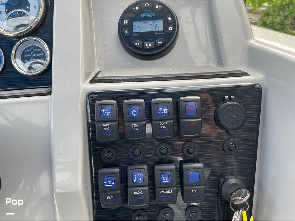 This beauty shines with a sleek Blue hull, snap-in marine carpet, and standard features like a Fusion Bluetooth stereo, bimini top, and 4-step swim ladder. The helm offers a fish finder and USB ports. Weighing ~3,200 lbs (4,200 lbs with engine), it's perfectly paired with the trailer for easy towing.