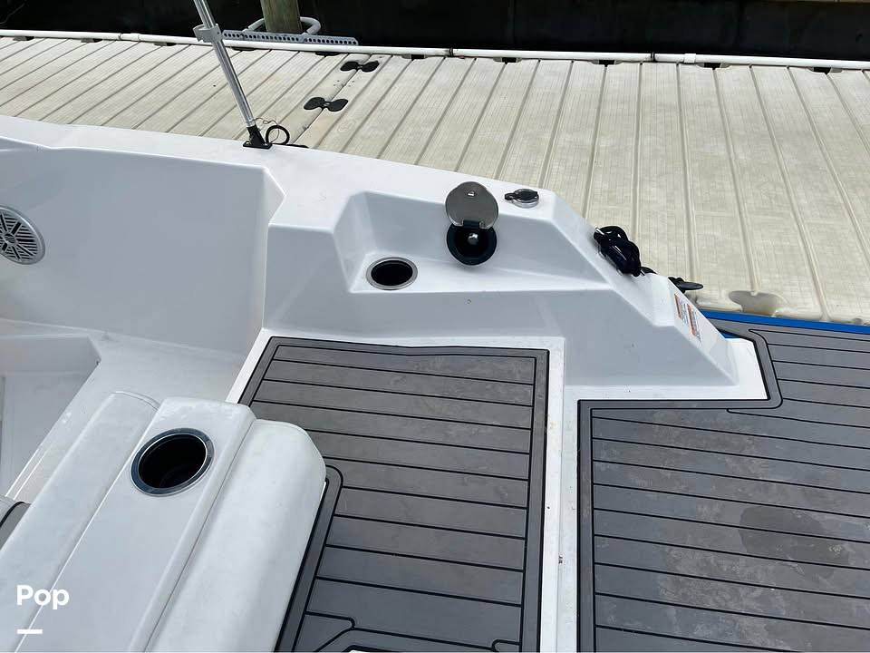 The spacious cockpit boasts bow lounge seating, aft foldaway lounge, helm bolster seat, and in-floor ski storage, perfect for watersports or relaxing.