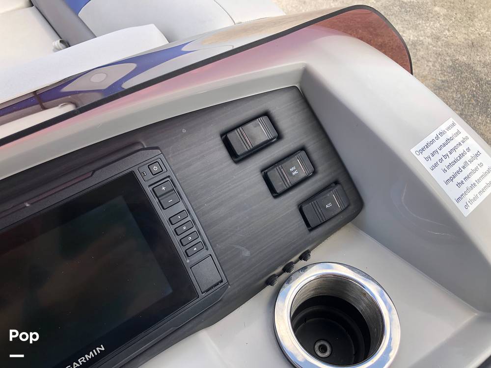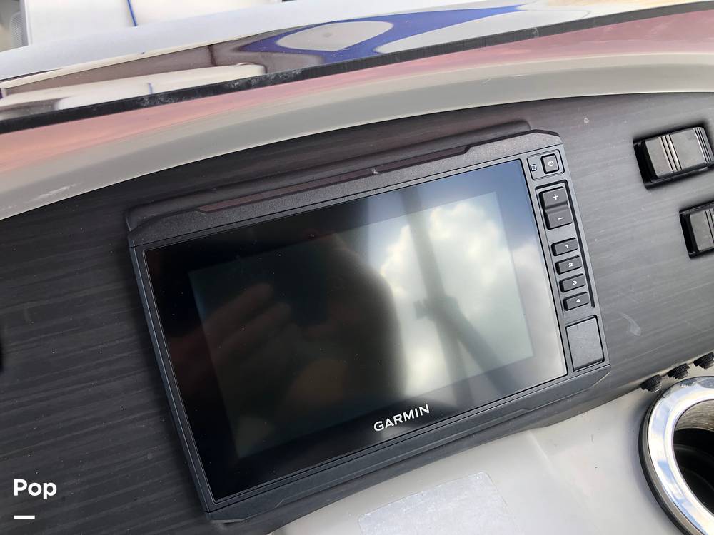It comes with Garmin electronics, a Kicker stereo media center, speakers everywhere, tons of storage, a nice bimini extending over large area, lounge seating, large swim platforms, boarding ladder, and a side gate for easy entry!