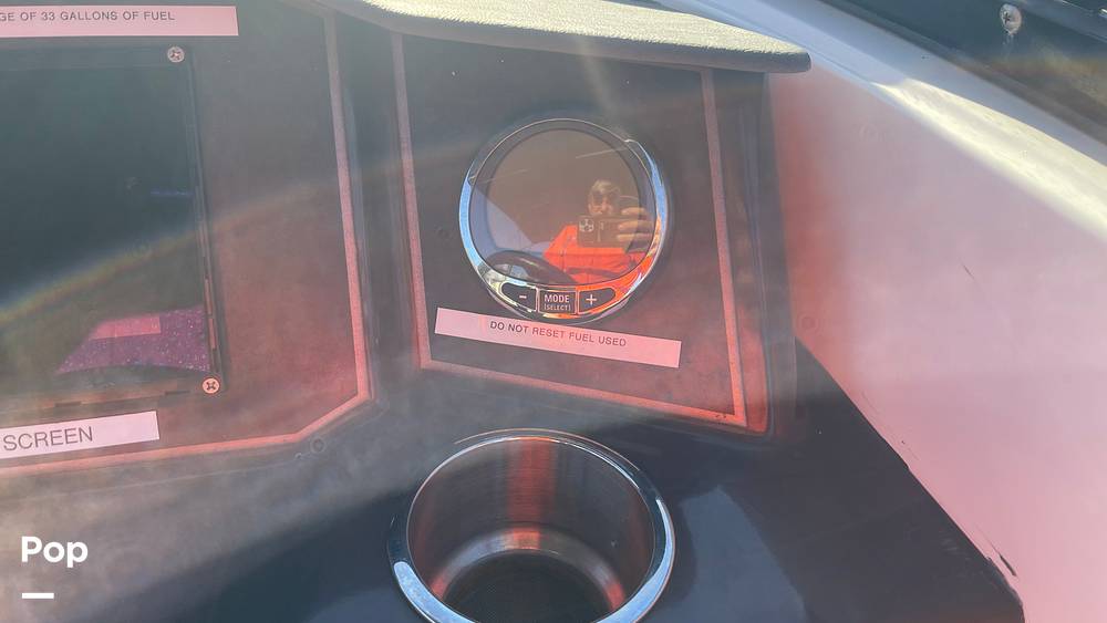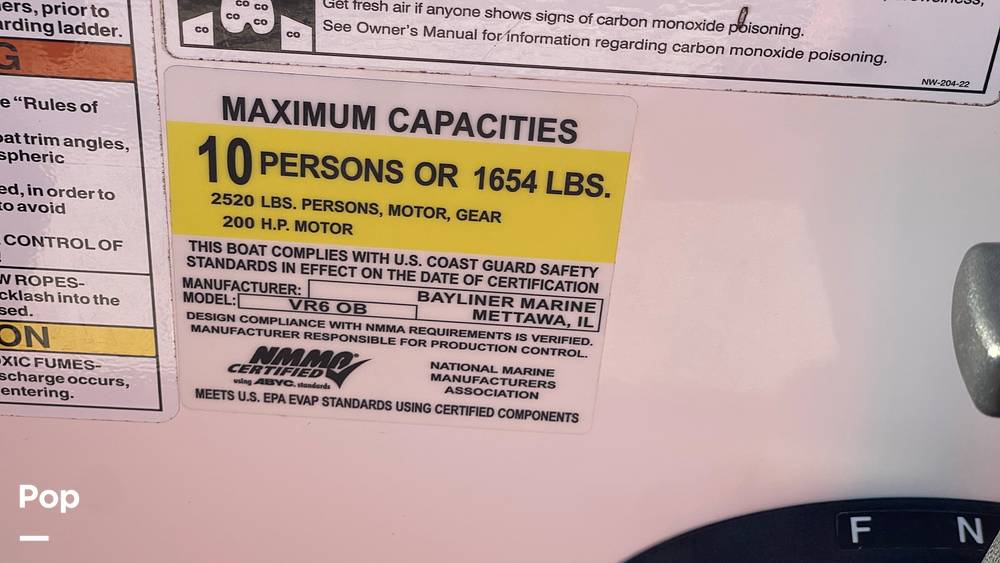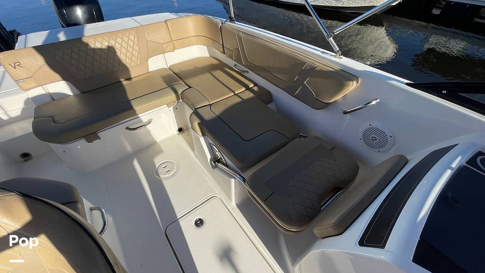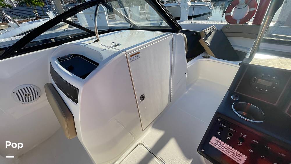 The Bayliner VR6 OB has seating for up to 10 passengers, a spacious layout with comfortable bow seating with storage below, a nice shady bimini, and a large swim platform. It includes a Bluetooth stereo system, a Simrad GPS, and a swim ladder for easy water access. There is a privacy compartment that will easily fit a porta-potty! The passenger seat has a flip-flop backrest.