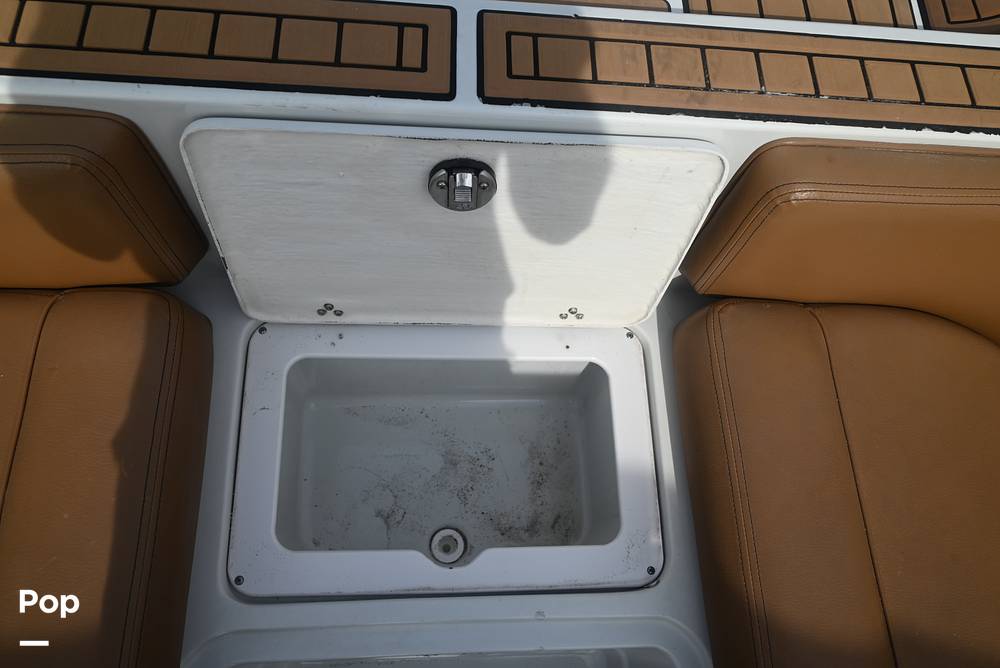 At the sporty starboard helm console, the Captain rides in style and comfort in the adjustable sport bucket helm seat with flip-up bolster. The Helm console has a sport-tilt steering wheel, a Garmin GPS Chartplotter digital display, and a large lockable storage compartment below.