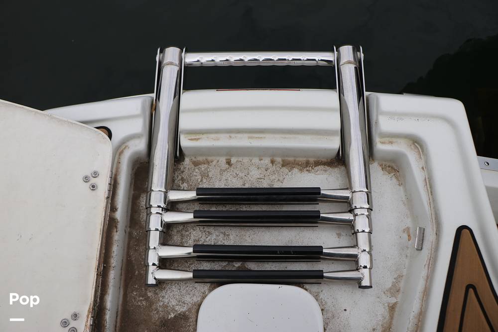 In the bow, twin forward-facing upholstered lounges with armrests and storage below. Also at the bow is a small casting deck or swim platform with sea-dek flooring and a stainless steel telescoping bow swim ladder.