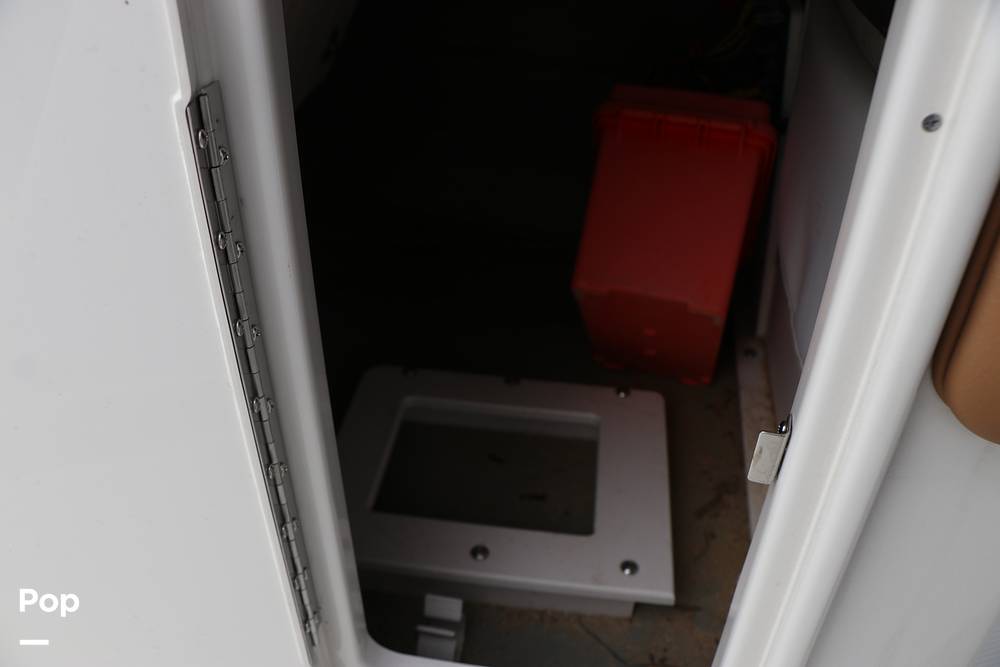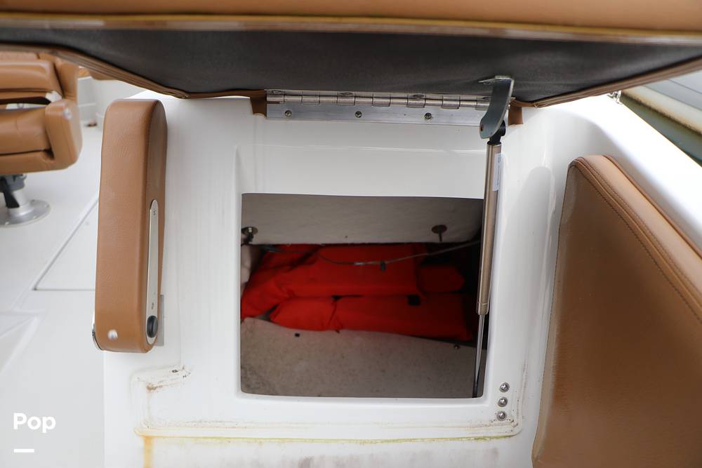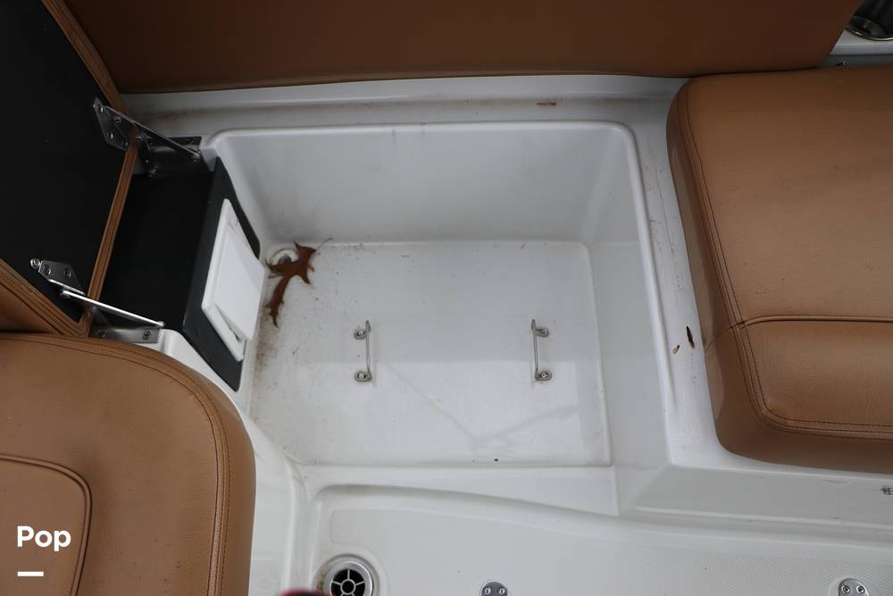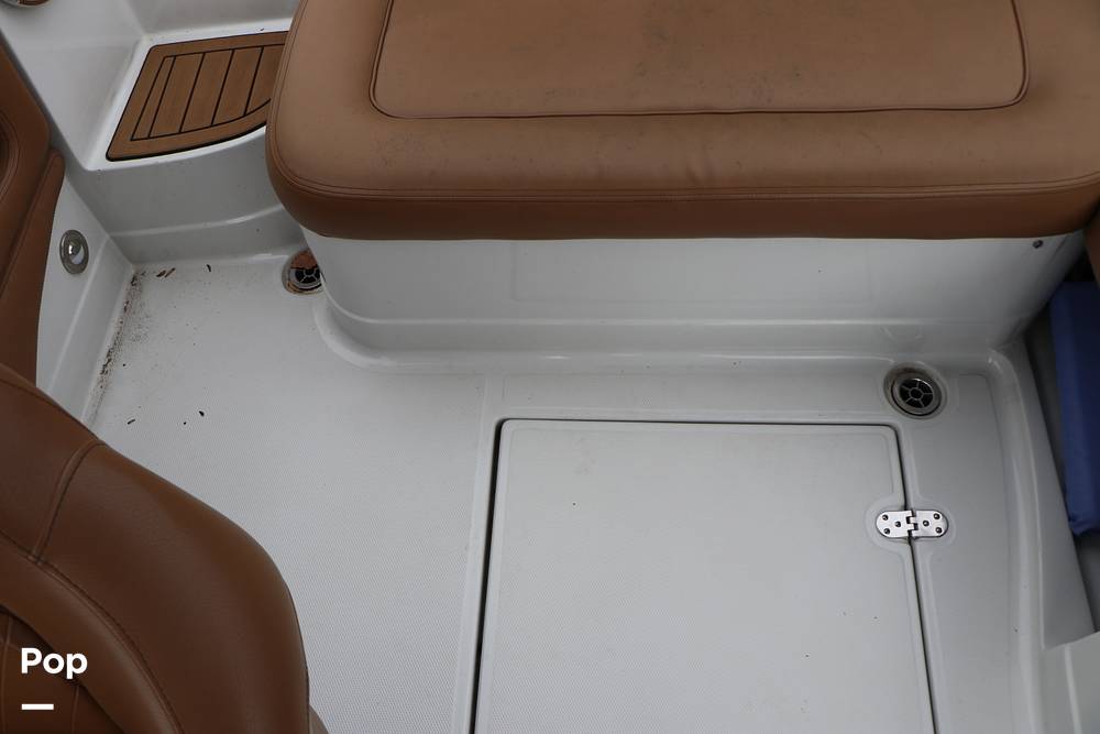 At the sporty starboard helm console, the Captain rides in style and comfort in the adjustable sport bucket helm seat with flip-up bolster. The Helm console has a sport-tilt steering wheel, a read Garmin GPS Chartplotter digital display, and a large lockable storage compartment below.