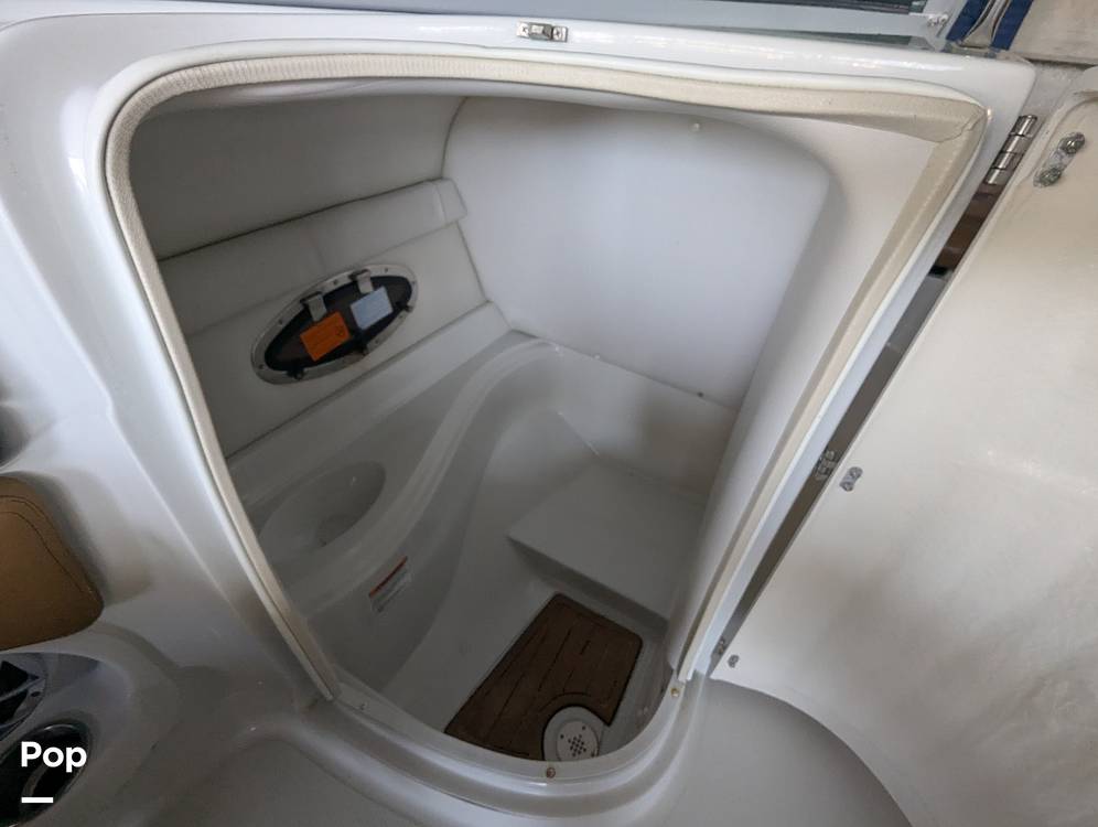 Moving aft, the Captain and portside companion ride in ultimate comfort in adjustable sport bucket seats with flip-up bolsters. Just forward of the portside companion seat is a fully enclosed head compartment with a handheld shower, sink, solid-surface countertop, and room for a porta-potty. In the cockpit, there is a starboard J-shaped aft lounge seat and a single seat to port.