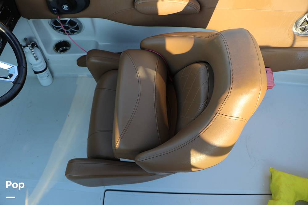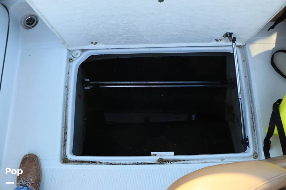 The rear seat backrest swivels to the rear so you can have a sun pad or sit comfortably in the rear while anchored. There are bow and stern ladders for easy boarding. There is a large bimini overhead for those hot summer days.