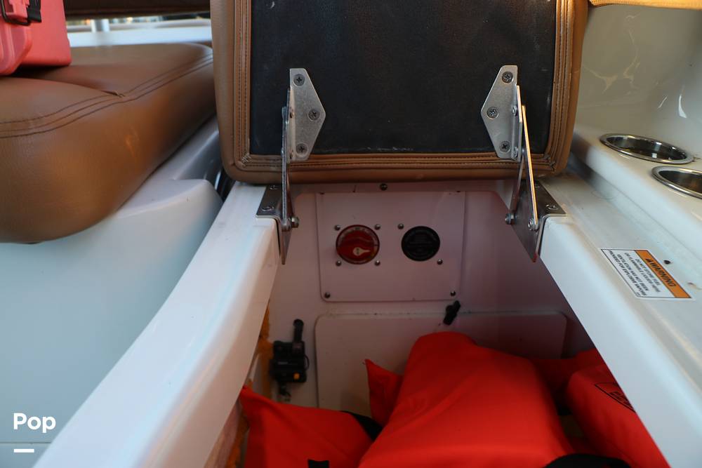 Moving aft, the Captain and portside companion ride in ultimate comfort in adjustable sport bucket seats with flip-up bolsters. Just forward of the portside companion seat is a fully enclosed head compartment with a handheld shower, sink, solid-surface countertop, and room for a porta-potty. In the cockpit, there is a starboard J-shaped aft lounge seat and a single seat to port.
