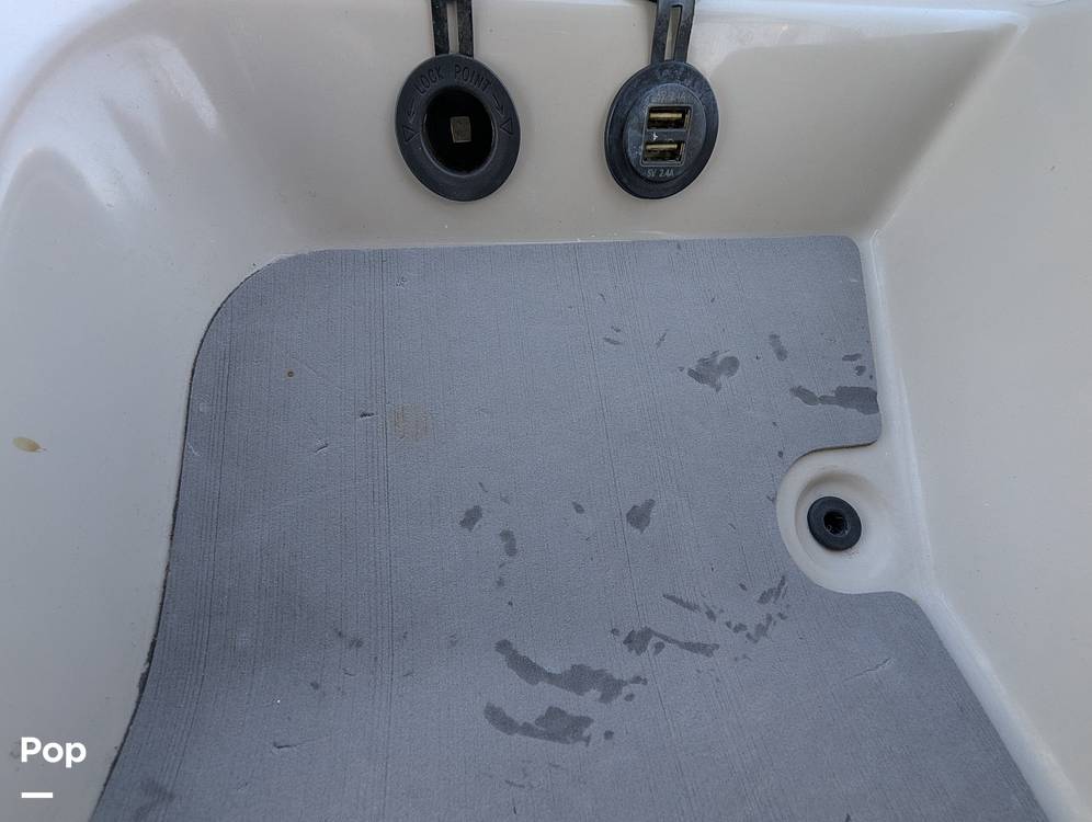At the helm, the Captain rides comfortably on an adjustable high-backed helm seat with flip-up bolster and armrests. A large aft swim platform provides water access with a heavy-duty telescoping stainless steel swim ladder. A large, easily deployable canvas bimini top protects from the elements.