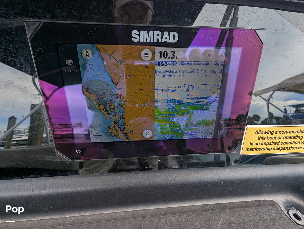 At the helm, the Captain rides comfortably on an adjustable high-backed helm seat with flip-up bolster and arm rests. A large aft swim platform provides water access with a heavy-duty telescoping stainless steel swim ladder. A large, easily deployable canvas bimini top protects from the elements.
