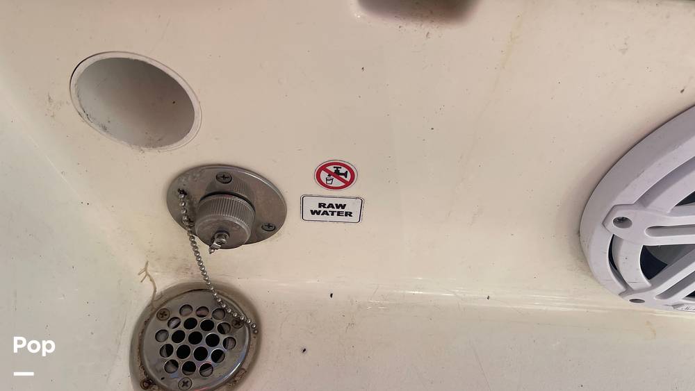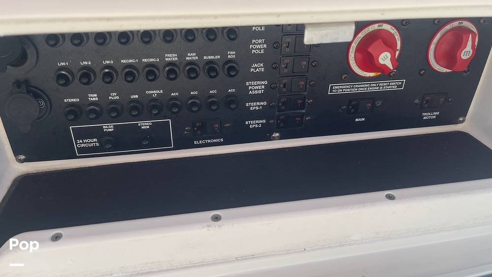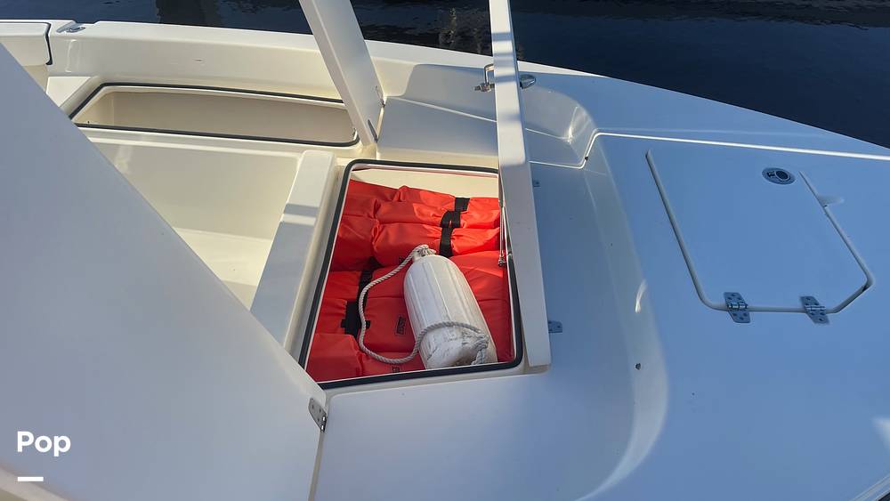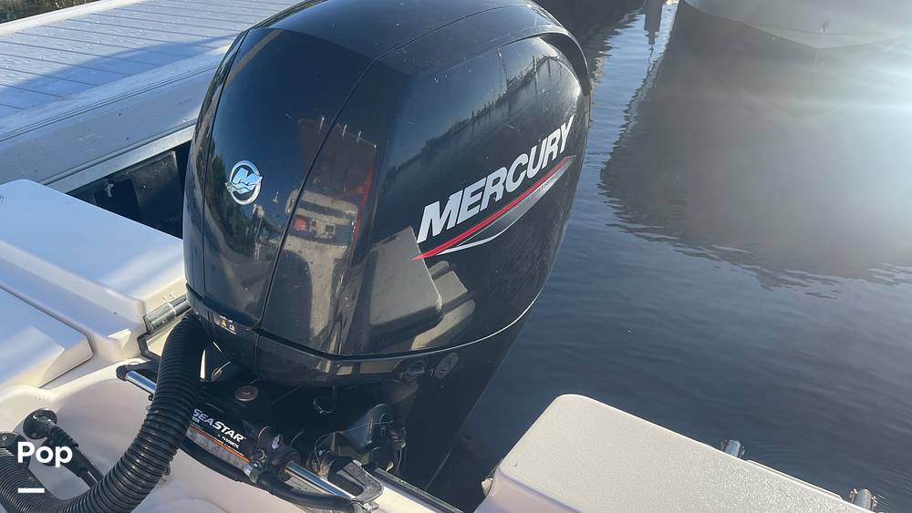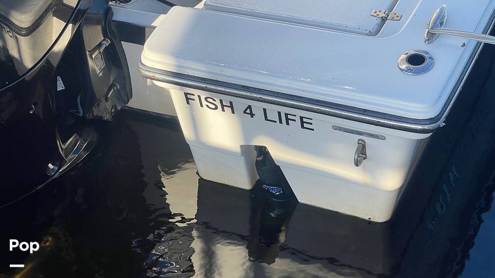 A Mercury 150 HP 4-stroke outboard engine powers it. The hull is sleek white with stylish graphics. For fishing enthusiasts, it has a spacious casting deck, multiple rod holders, a live well, and ample storage.