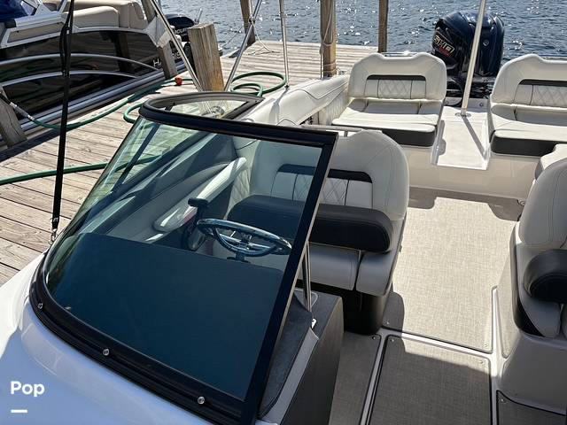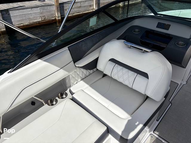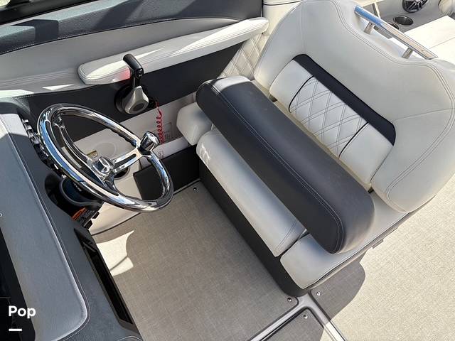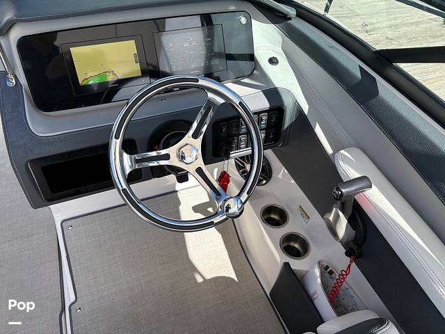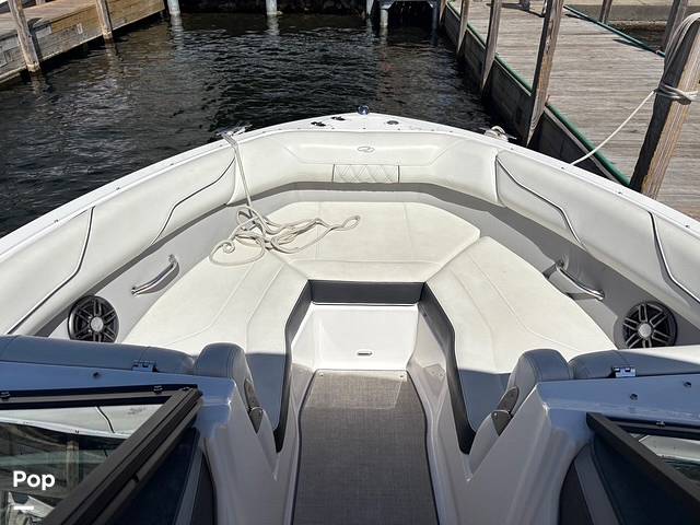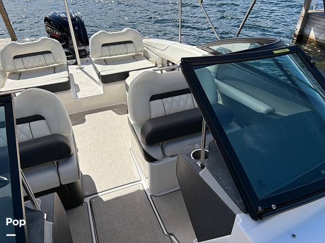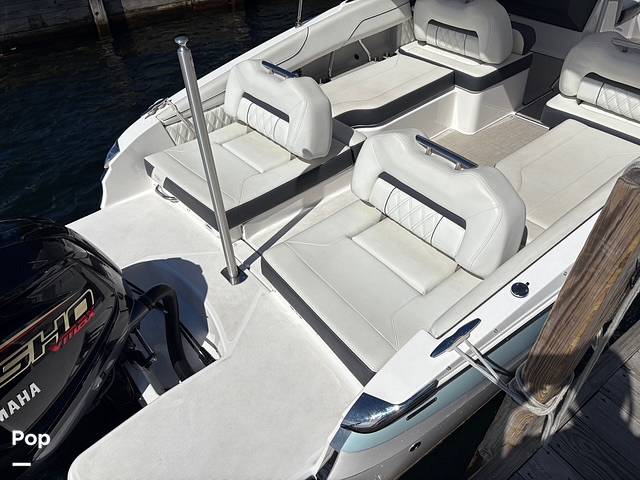 There's bow seating that converts to a sun pad, an electric-powered helm seat, a walk-through windshield, and twin Garmin displays at the helm.