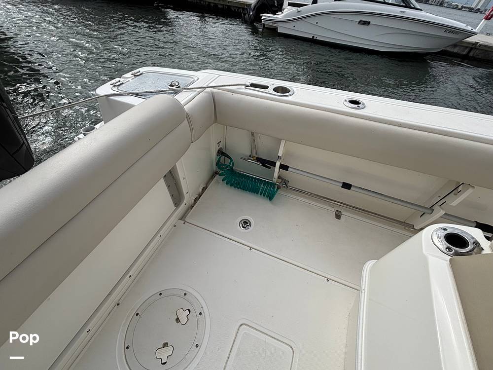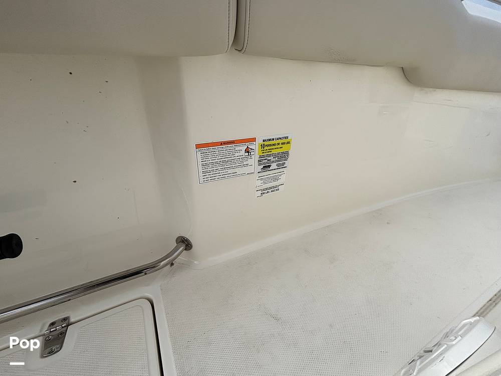 Fiberglass console with interior lighting, multiple stainless steel drink holders and grab rails throughout, and helm and companion footrests for all-day comfort. Practical features like the fire extinguisher storage pocket, dual 12V receptacles for electronics, and an opening port light with a screen for ventilation show the thoughtful design that Boston Whaler is known for.