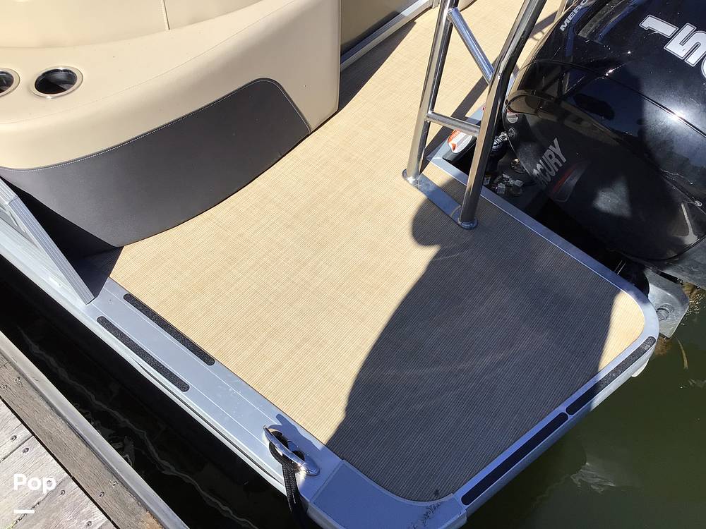 This Harris HCX23 offers amenities such as a Bimini top for shade, a swim ladder for easy access to the water, and a helm console with various controls.